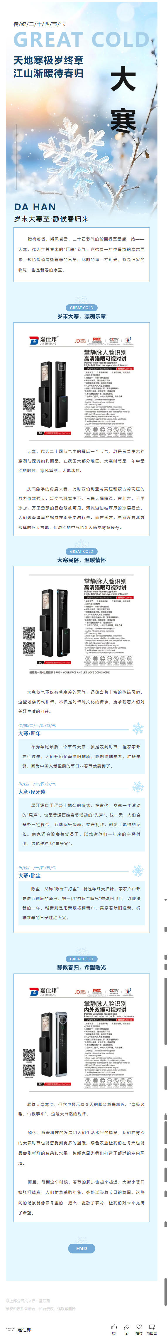 Jashibang Facial Recognition Smart Lock | Great Cold: Wind whistles through northern doors, frost's chill is heavy; clouds press down on southern mountains, snow's intent is high