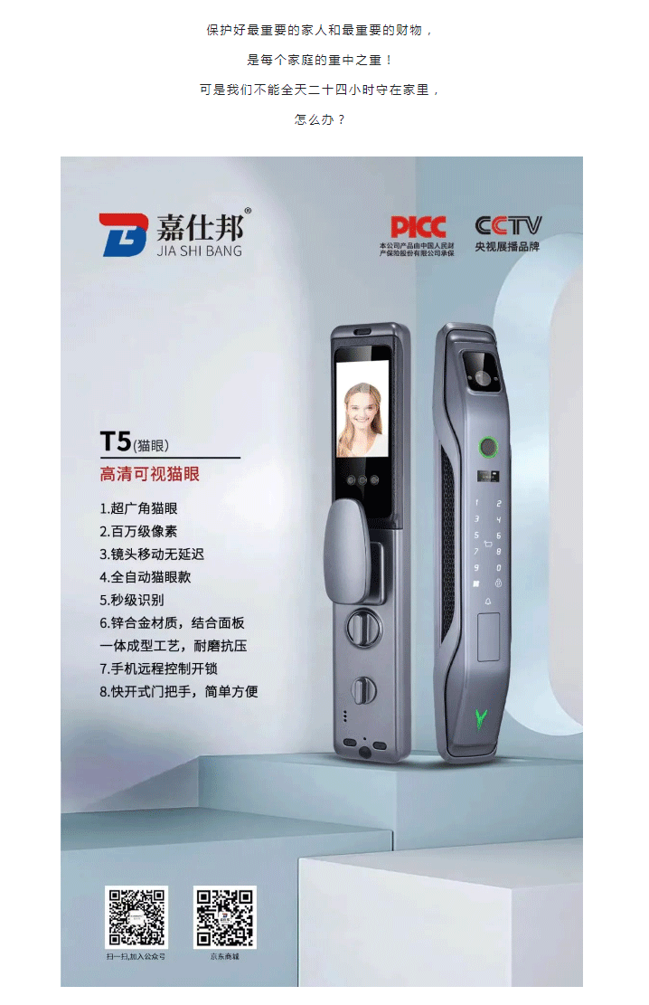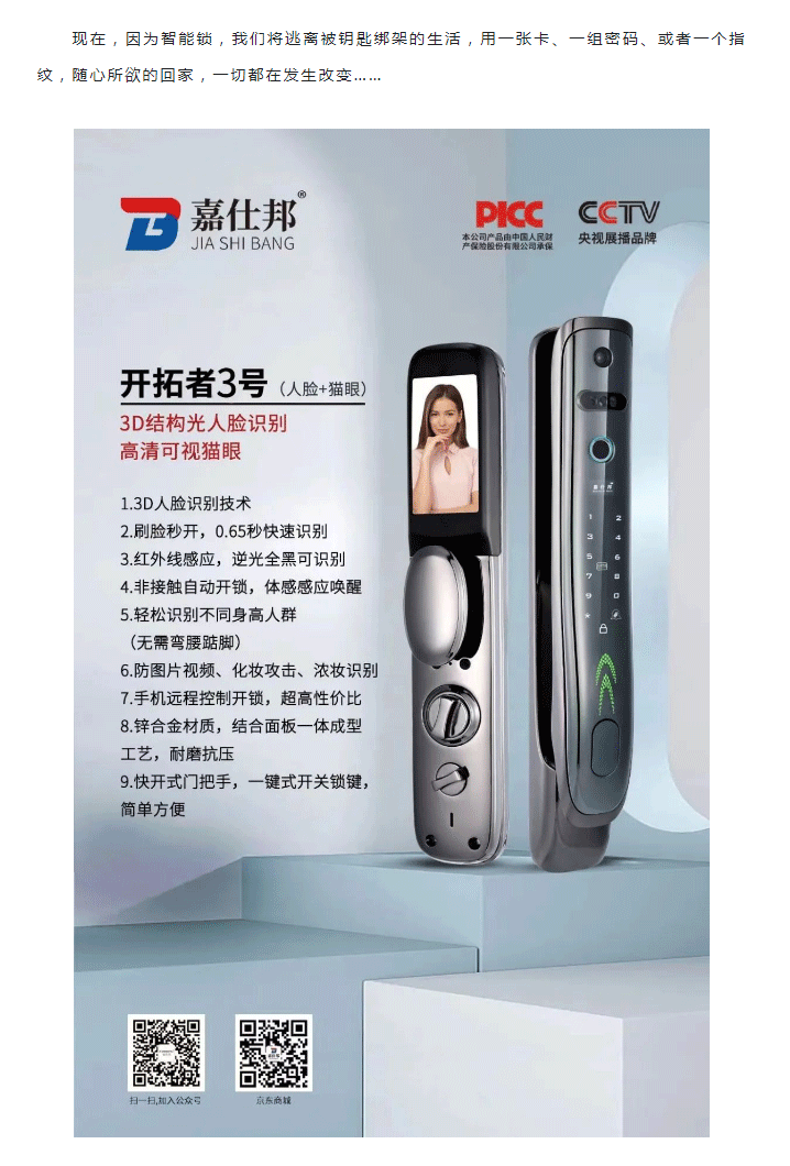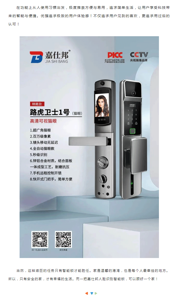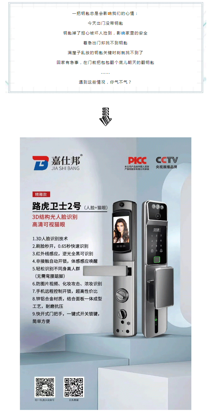 嘉仕邦人脸识别智能锁丨只有安全的家,才有幸福的生活!