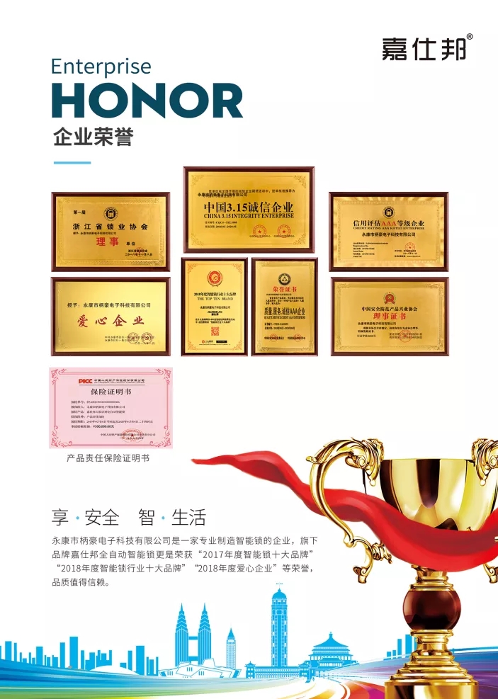 3.作为浙江最大人脸识别智能锁公司,我们拥有一批年轻而富有创新精神的专业化管理和技术研发团队,具有人脸和指纹自主研发实力。2017-2018-2019年荣获全国智能锁行业十大品牌,荣获爱心企业荣誉等多项殊荣!